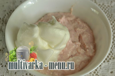 Додайте білки до сиру. Обережно перемішайте виделкою тісто, щоб не зруйнувати структуру збитого білка.