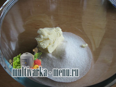 Насипаємо у велику скляну миску цукор. Масло вершкове використовуємо розм’якшене. Тому подбаємо про це і заздалегідь, виймаємо його з холодильника. Додаємо до нашого цукру масло.