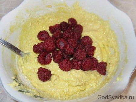 - В отримане тісто висипте малину і також акуратно вимішуйте. Досить зробити кілька рухів ложкою, просто щоб рівномірно розподілити ягоди.