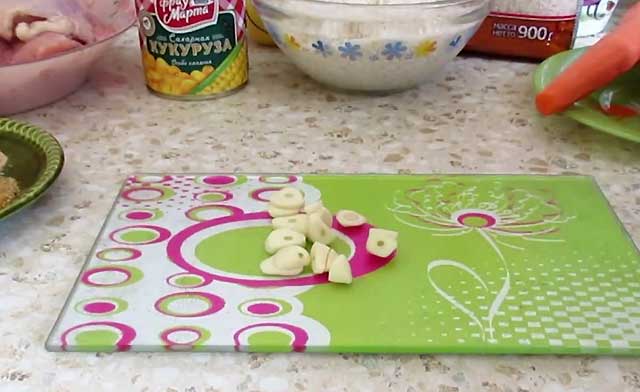 На великі шматочки подрібнюємо часник (одну часточку ділимо на 3-4 частини).