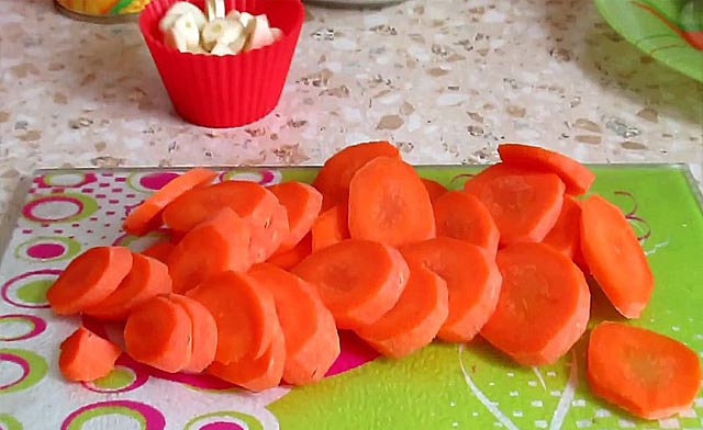 Моркву нарізаємо кружечками, а помідор скибочками. На дрібні кубики краще не подрібнювати.