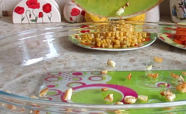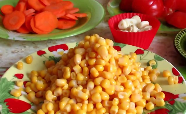 Злити рідину з банки. Кукурудзу висипати до овочів і перемішати.