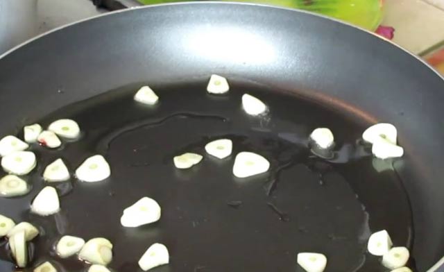 У розпеченій сковороді обсмажуємо часточки часнику не більше 2 хвилин. Прибираємо часник зі сковороди.