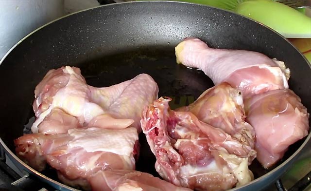 Відправляємо на сковороду шматочки курки. Смажимо перевертаючи по 2 хвилини з кожного боку.