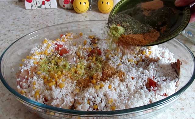 Розрівнюємо рис по поверхні форми і тільки тепер додаємо приправи. Солити не треба, сіль є в приправі для курки (див. список інгредієнтів).