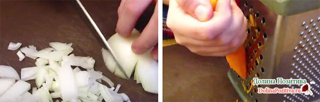 Дрібно нарізаємо цибулю, відкладаємо його в окрему миску. Моркву натираємо на крупній тертці.