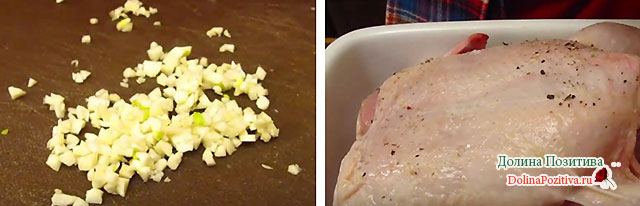 Дрібно рубаємо часник. Тушку натираємо сумішшю з солі, перцю і часнику.