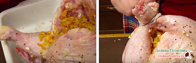 Начиняємо курку рисом з овочами за допомогою ложки. Курячі ніжки пов’язуємо звичайною ниткою.