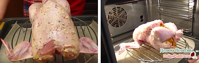 На деко встановлюємо грати і на неї кладемо курку цілком. Так тушка обсмажиться з усіх боків, покриється апетитною рум’яною скоринкою. Час приготування — 40-60 хвилин.