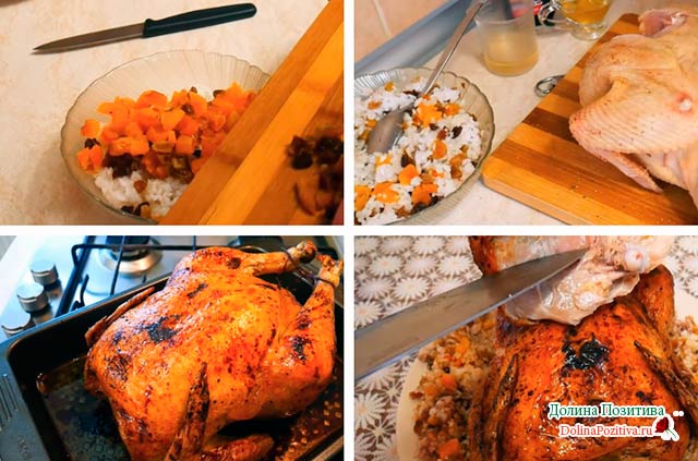 Фарширувати її будемо відварним рисом з сушеними фруктами і дрібно порубаними потрошками птиці.