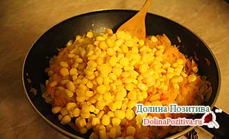 Додаємо моркву, помідори, консервовану кукурудзу (4,5 ст. ложки з гіркою) і рис, промитий в декількох водах.