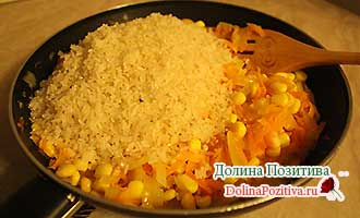 Рис добре промити, додати в сковороду до овочів. Знову ретельно перемішати. Сковороду прибрати з вогню і залишити на деякий час, щоб рис просочився маслом (такий лайфхак зробить рис розсипчастим).