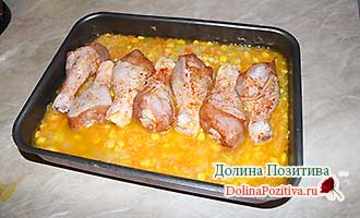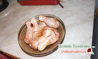 Суміш залишаємо в спокої. Починаємо займатися курячими гомілками. М’ясо натираємо паприкою, сіллю, перцем або іншими, на свій смак, спеціями.