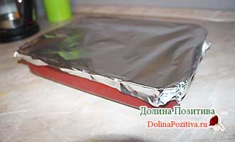 Переносимо форму в розігріту до 200 градусів духовку. Готуємо страву приблизно 1год. — 1ч. 15 хв. За 30 хвилин до готовності фольгу знімаємо і доводимо до готовності вже без фольги.