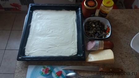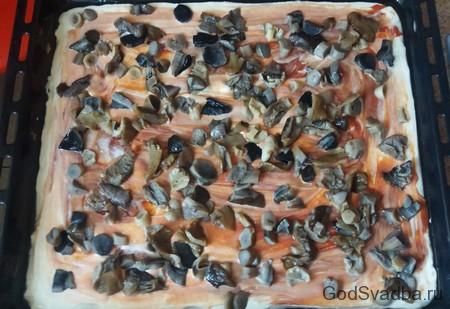 Примітка. Якщо гриби консервовані, то відразу викладайте їх на тісто. Якщо грибочки сирі, то обварите їх злегка, достатньо 2-3 хвилин після кипіння. Після того, як гриби ошпарити, злийте воду через друшляк, остудіть їх, а потім викладіть на тісто.