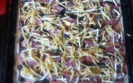 Крок 11. Деко з піцою ставимо в розігріту духовку. Готуємо при 180 градусах 30 хвилин. Через 20 хвилин дістаньте піцу, посипте її залишилися сиром і приберіть ще на 10 хвилин.