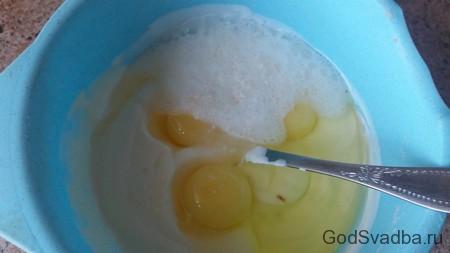 Крок 3. Далі в миску розбиваємо 3 яйця, додаємо сіль і соду. Соду слід погасити оцтом. Ретельно все перемішуємо.