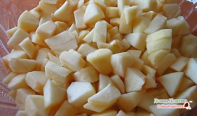 Яблука розрізаємо на 4 частини, виймаємо насіння. Кожну четвертинку подрібнюємо на невеликі кубики.