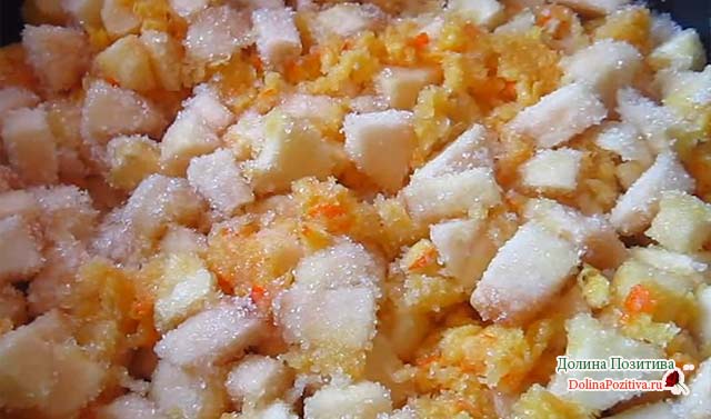 Антонівку і перекручену масу з’єднуємо в одному посуді, додаємо цукровий пісок. Перемішуємо.