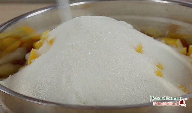 Дрібно нарізаємо фрукти, складаємо в одну ємність, додаємо цукор-пісок. Нехай маса постоїть, щоб цукор став мокрим від фруктового соку.