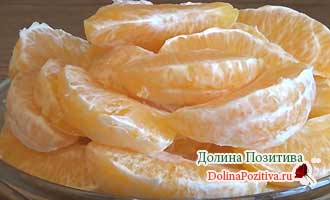 З цитрусових знімаємо шкірку, акуратно поділяємо апельсини на часточки.