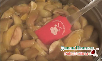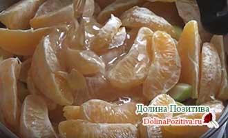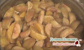 В іншу 5-літрову каструлю викладаємо яблука і плоди цитрусової культури, туди ж відправляємо гарячий сироп. Відключаємо конфорку відразу після закипання.