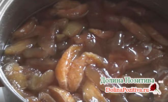 Варення охолоджується до кімнатної температури. Потім знову включаємо піч і варимо фрукти з цукром ще 30 хвилин. Під час варіння 4-5 разів ложкою утапливаем фрукти в сиропі, так плоди зваряться рівномірно.