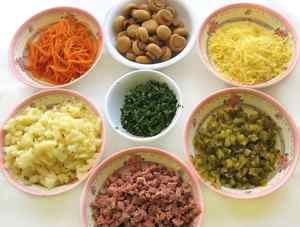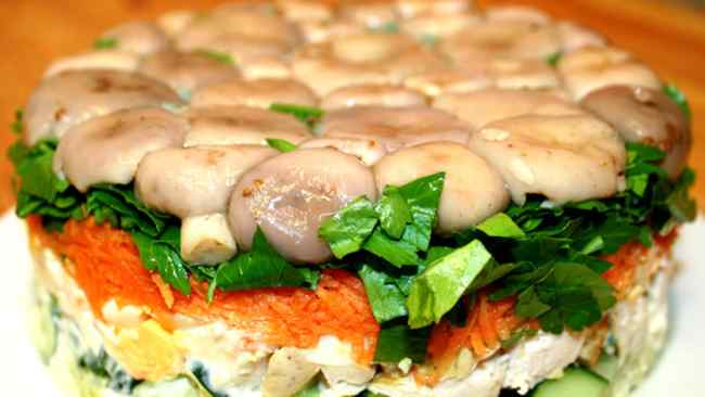 Для приготування салату краще заздалегідь підготувати глибоку миску. Шари викладаються, починаючи з грибів. Надалі завдяки невеликої хитрості грибочки виявляться зверху страви. Я наведу приклад кількох поєднань інгредієнтів, незмінним компонентом будуть тільки гриби.