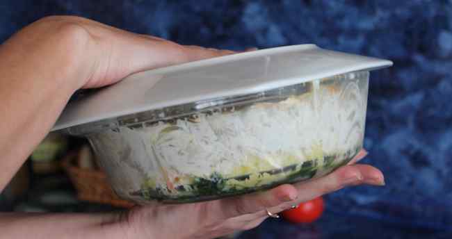 Накрийте Миску плоскою тарілкою і поставте салат в холодильник на 20-30 хвилин. Притримуючи обидві частини конструкції з тарілок переверніть миску дном вгору і зніміть її з салату.