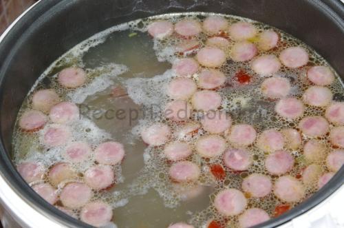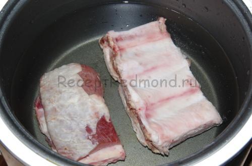 Відваріть бульйон з сирих ребер на режимі випічка. Після закипання посоліть бульйон, зніміть піну і варіть протягом 40 хвилин.