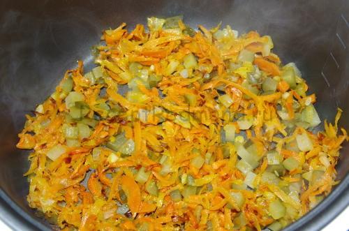 Натріть на крупній тертці моркву, дрібно поріжте цибулю і на режимі смаження обсмажуйте до золотистого кольору. Якщо огірки великі, бажано зняти з них шкірку, а в маленьких можна так не робити.