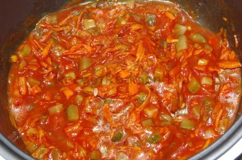 Додайте туди нарізану дрібними кубиками огірок і томатну пасту, розведену розсолом від огірків. При його відсутності можна зробити піджарку і на простому бульйоні, але, якщо хочете насичений кисло-солодкий смак, можна використовувати розсіл від маслин, помідор або що є в холодильнику.