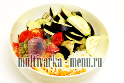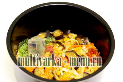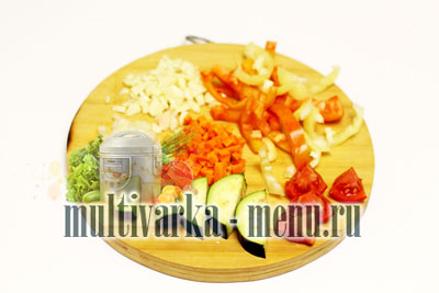 У чашу мультиварки додаємо рослинне масло. Викладаємо підготовлені овочі. Закриваємо кришкою. Виставляємо режим «мультишеф» на 20 хвилин при температурі 115 градусів.