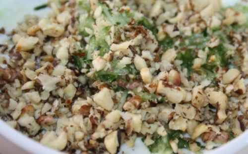 • Горіхи очистимо від шкаралупи, зелень нашинкуем, сир наріжемо великими шматочками.