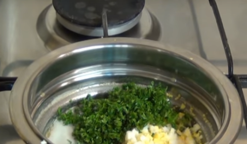 • Зелень дрібно наріжемо і заправимо сіллю, краще взяти ароматну адыгейскую.