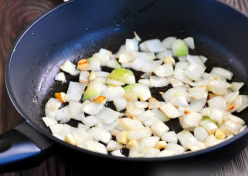 • Наріжемо лук, часник і обсмажимо на рослинному маслі.