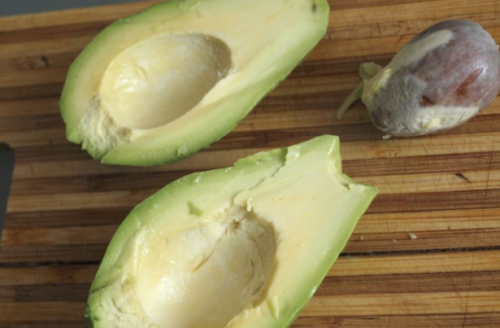 • Авокадо ділимо навпіл, видаляємо кісточку, очистити шкірку і нарізаємо на великі шматки.