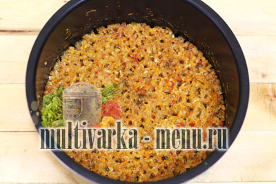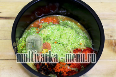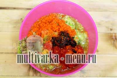 У чашу мультиварки завантажуємо підготовлену подрібнену масу. Добре перемішуємо. Приправляємо до смаку сіллю, меленим перцем. Додаємо столовий оцет. Закриваємо щільно кришкою, включаємо режим «гасіння» на 1 год, температура за замовчуванням 114 градусів.