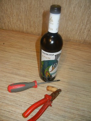 Інструменти перераховані в тій же послідовності, в якій вони будуть потрібні. Спочатку за допомогою викрутки або шуруповерта глибоко в пробку слід вкрутити шуруп, а потім висмикнути її за допомогою пасатижів, вхопившись за ними голівку шурупа.