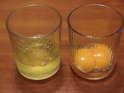 Збийте міксером другу половину склянки цукру з жовтками. Цукор в жовтках розчиняється набагато гірше, ніж у білку, тому, якщо ви не хочете, щоб в кремі похрускували на зубах кристалики цукру — їх краще попередньо змолоти в пудру. Як на мене — це дуже приємно…