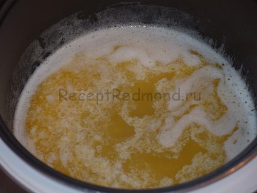 Включіть в мультиварці режим випічка і розчиніть вершкове масло. Коли у вас воно розтане наполовину — можна вимикати прилад і закривати кришку, так як від гарячої температури воно у вас саме дораспустится повністю.