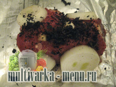 Поставити форму для пароварки і покласти в неї м’ясо у фользі.