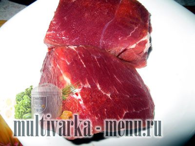 М’якоть яловичини обмити і протерти насухо серветкою. Порізати на 2 шматки, щоб швидше приготувалося.