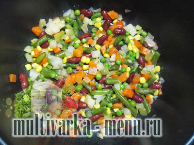 Включаємо мультиварку, встановлюємо режим «Смаження» на 15 хвилин, виливаємо 1 столову ложку рослинного масла і перекладаємо заморожені овочі.