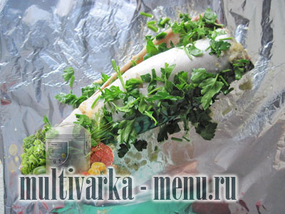 Звертаємо гарненько фаршировану скумбрію у фольгу. Переміщаємо в чашу пароварки.