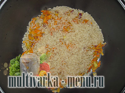 У чашу мультиварки викладаємо готову зажарку, розрівнюємо. Зверху рівномірно висипаємо рис (я використовую хороший пропарений рис, який не можна промивати).