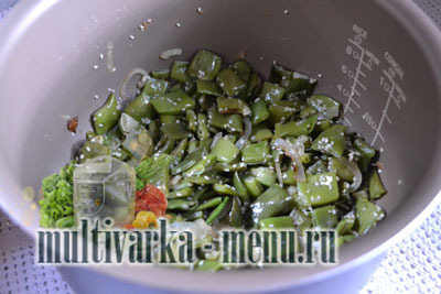 Поки готуватися квасоля ви встигнете нарізати цибулю півкільцями. Потім його потрібно трохи обсмажити в чаші мультиварці на режимі «смаження» протягом 5 хвилин.