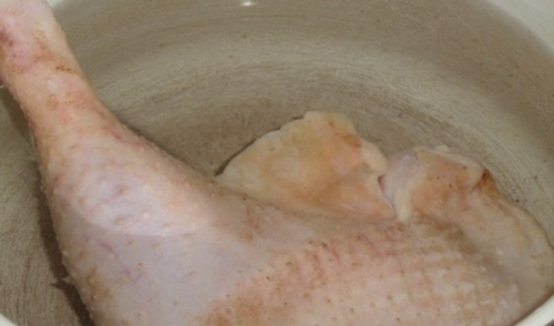 - У каструлю наповненою водою опускаємо м’ясо птиці, ставимо на вогонь і варимо до готовності.