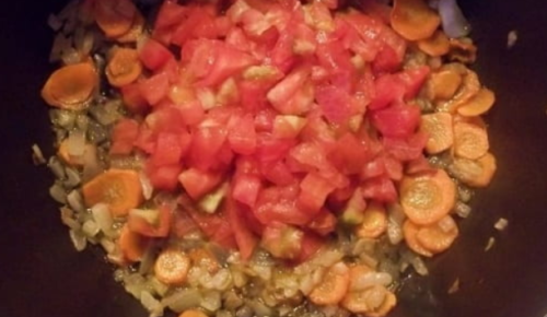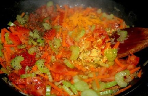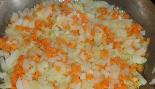 - До м’якості обсмажуємо на сковороді з маслом цибулю і моркву, потім додаємо до овочів сельдерей, томати і при бажанні пропущені через прес часточки часнику, смажимо інгредієнти 6-7 хвилин.