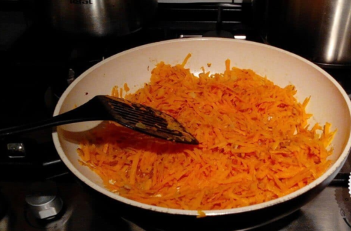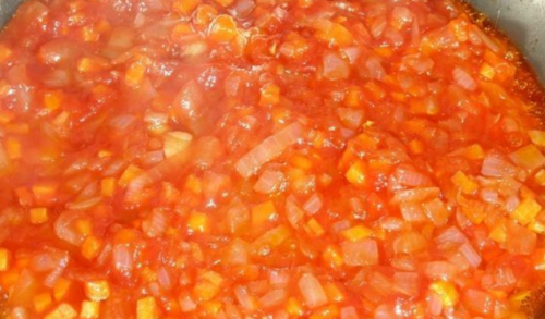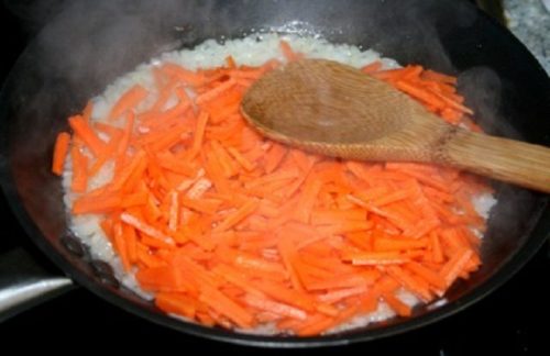 - Цибулю з морквою пасеруємо на сковороді з невеликим додаванням соняшникової олії протягом трьох хвилин, потім кладемо томат-пасту, перемішуємо, витримуємо на вогні 3 хвилини і знімаємо з плити.